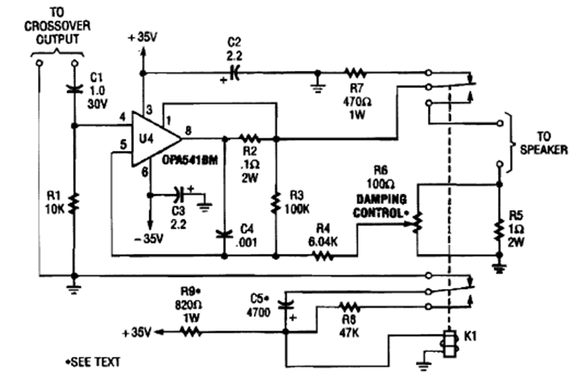 Este circuito, presente en una Popular Electronicsr de los años 90, proporciona 100 W de potencia. La fuente de alimentación es de 25 V y el circuito integrado debe estar equipado con un disipador térmico.