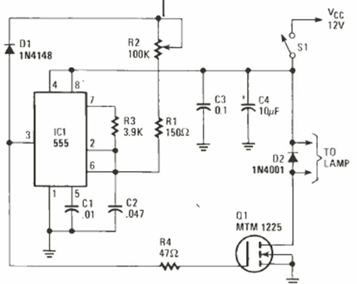 Este regulador de intensidad se encontró en los proyectos especiales de la Electronics Experimenter Special Projects de 1983. El circuito utiliza componentes comunes. El MOSFET puede ser de cualquier tipo dependiendo de la lámpara.