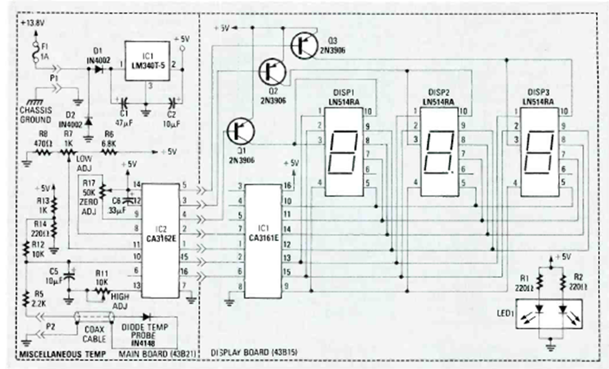 Este circuito mide la temperatura midiendo la caída de voltaje a través de un diodo. El circuito fue encontrado en la revista Radio Electronics Experiment de 1992. El circuito es digital de 2 dígitos.