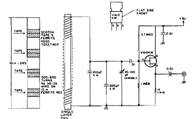 Este circuito para el rango de 60 kHz se encontró en la revista 73 y se publicó en 1995. El circuito utiliza un bastón de ferrita. Observe la dirección de los devanados de la bobina.