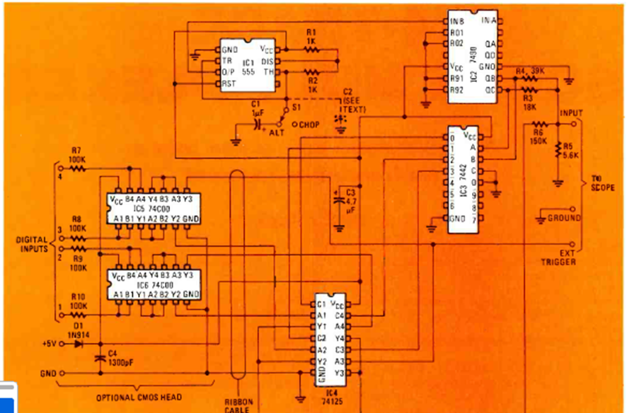 Aunque está hecho para osciloscopios antiguos de hasta unos pocos megahercios, este circuito convierte su dispositivo de 1 traza en un dispositivo de 4 trazas. El circuito es de la revista Electronics Experimenter Handbook de 1980.