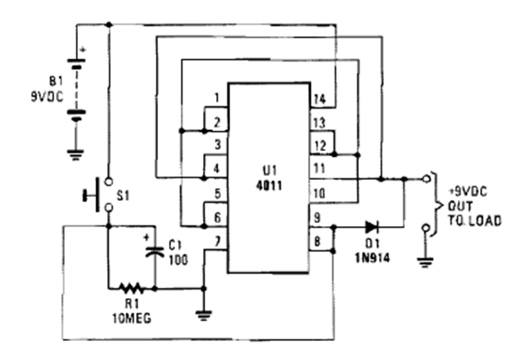 Este circuito apaga automáticamente pequeños dispositivos alimentados por batería después de cierto tiempo, ahorrando batería. Lo encontramos en una revista Popular Electronics de los años 90.
