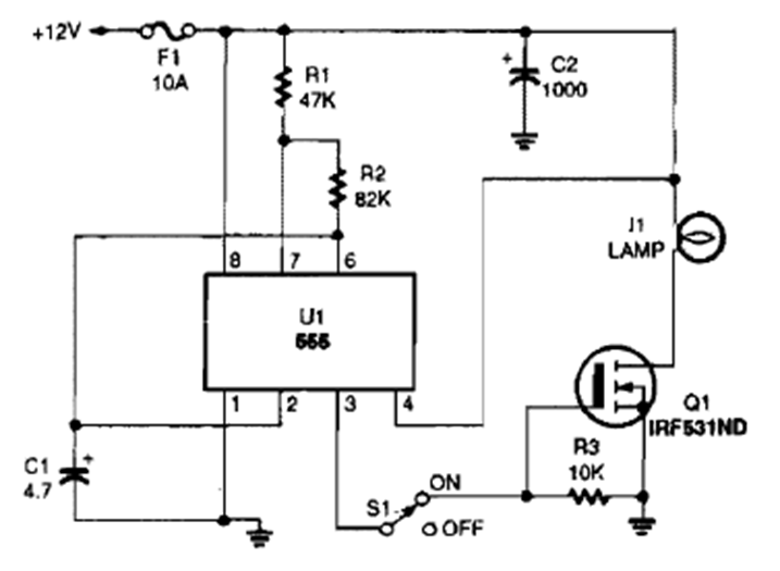 Este potente pulsador utiliza un MOSFET de potencia. Lo encontramos en una revista Popular Electronics de los años 90. El MOSFET debe montarse en un disipador de calor.
