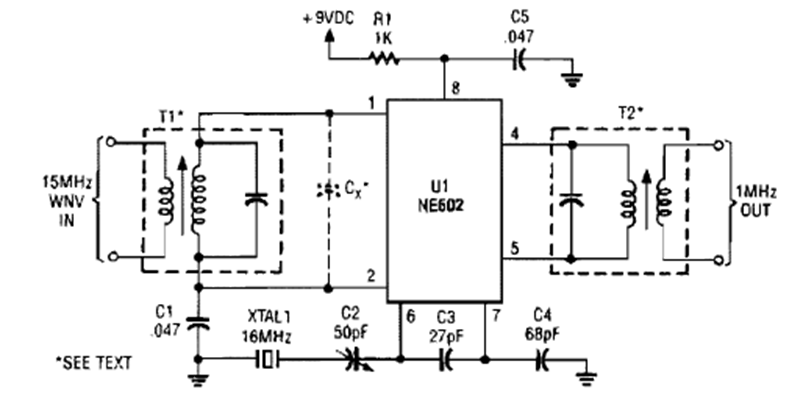 Este convertidor para señales de estaciones de referencia horaria WWV se encontró en Popular Electronics. Las señales de 15 MHz ahora se reciben en una radio de onda media a 1 MHz.