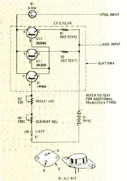 Este circuito para probar fuentes de hasta 10 A se encontró en la revista Radio Electronics Special Projects de 1983. El circuito requiere buenos disipadores térmicos para los transistores.