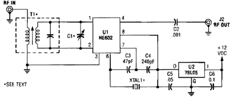 Encontramos este r circuito numa Popular Electronics de la década de 1990. El transformador T1 determina el rango de frecuencia recibido y el cristal de frecuencia en el que se recibirá la señal convertida.