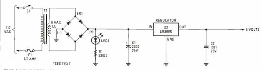 Éste es uno de los muchos usos posibles de los reguladores integrados. Esta fuente de alimentación para experimentador del Electronics Experimenter Special Projects de 1981 utiliza un transformador de un solo devanado con rectificación de puente.