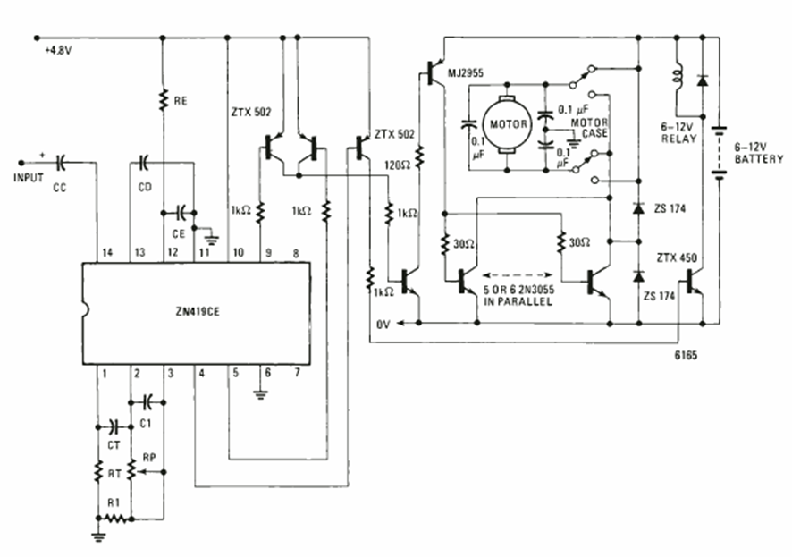 Este circuito es de una Electronics Experimenter Special projects de 1981. El circuito utiliza un circuito integrado especial de la época y la potencia depende de los transistores de salida.