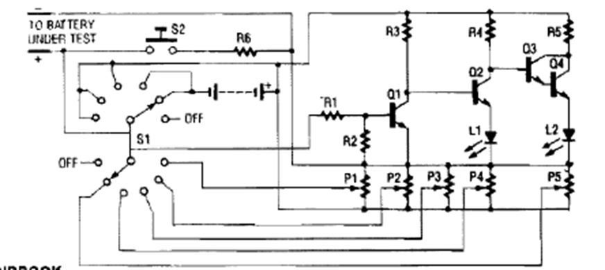 Este circuito de prueba se encontró en el Hobbyst Handbook (PE) en una edición de la década de 1990. El circuito prueba la batería bajo carga. La carga, al seleccionarse la batería mediante el interruptor.