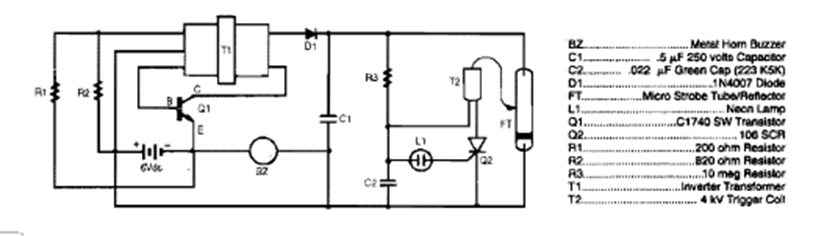 Este circuito, que se encuentra en la Enciclopedia de Circuitos Electrónicos, volumen 5 de 1995, utiliza un transformador. El circuito alimenta un transformador que produce 200 V para una lámpara de xenón.