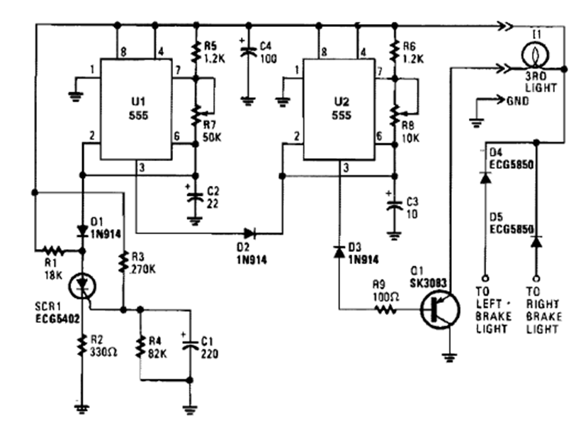 Este circuito se obtuvo de la publicación PE Hobbyist Electronics de 1980. El circuito se basa en el 555, es fácil de ensamblar y puede utilizarse para controlar las luces de freno.