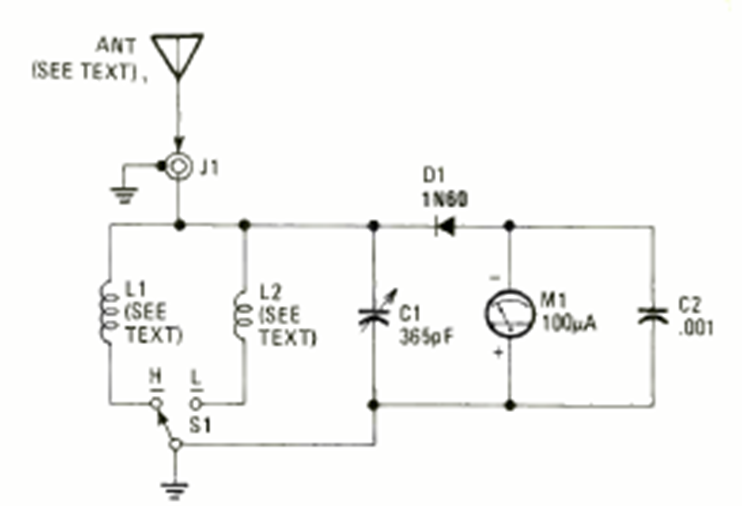 Este circuito simple para el rango de 3 a 30 MHz se encontró en el Elecrronics Experimenter Handbook Special Projects de 1983. Las bobinas constan de 10 y 50 vueltas de 32 hilos en una resistencia de 1 M x ½ W.