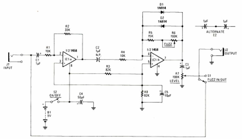 Este circuito con condiciones de operación comunes se encontró en la edición de 1993 de Radioelectronics Special Projects. El circuito está intercalado entre la pastilla y la entrada del amplificador.
