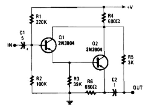Esta etapa amplificadora de dos transistores se obtuvo de la Enciclopedia de Circuitos Electrónicos, volumen 5 de 1995. La entrada es de alta impedancia y la salida se realiza en R3.