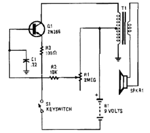 Este oscilador utiliza un pequeño amplificador de transistores o un transformador de salida de radio. Lo encontramos en una revista Popular Electronics de los años 90.