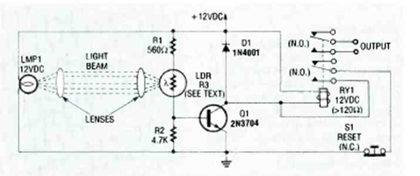 Este sencillo circuito de alarma óptica se encontró en el Electronics Experimenter Hanbook de 1991. El circuito utiliza una bombilla como emisor, pero podría utilizar LED.