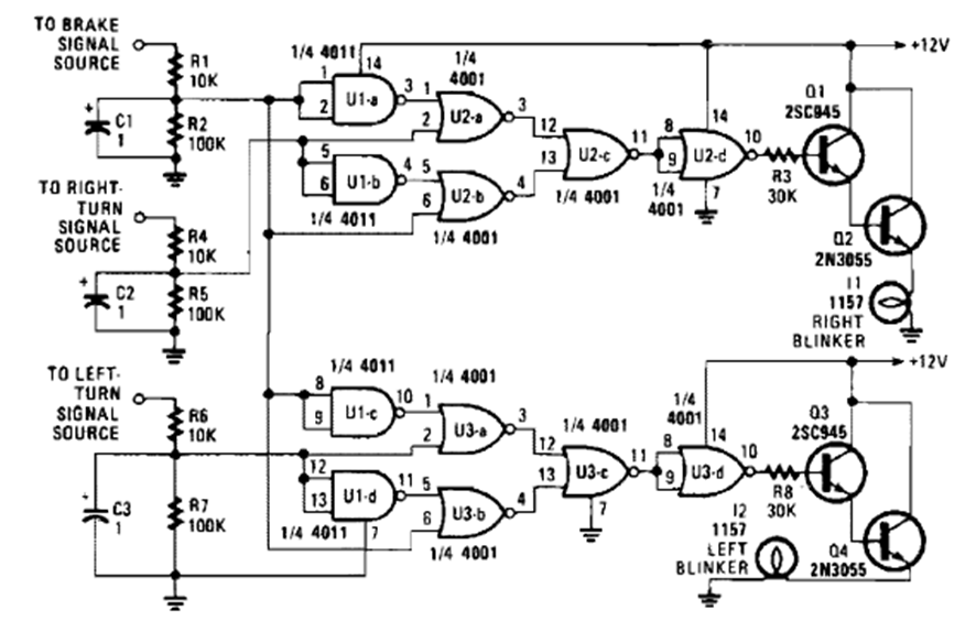 Este circuito para coches de la época se encontró en una revista Popular Electronics de los años 90. El circuito se basa en la lógica CMOS, común incluso hoy en día.