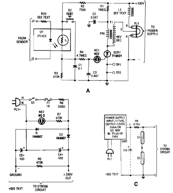 Encontramos este circuito en el volumen 5 de la Enciclopedia de Circuitos Electrónicos de 1995. Emite una luz de xenón pulsante de alta potencia.