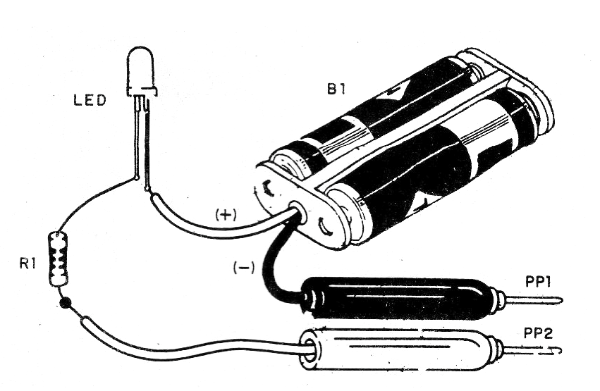 Las puntas de prueba pueden ser adquiridas en casas especializadas o improvisadas con clavos. La resistencia puede tener valores entre 100 ohmios y 470 ohmios. Observe en el montaje la posición del LED.