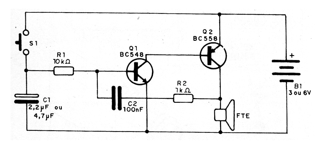 Para producir una especie de silbido bien agudo empleamos un oscilador de audio con dos transistores. La frecuencia de este silbido es dada básicamente por el capacitor C2 y por R1. Puede cambiar estos componentes para modificar el sonido.