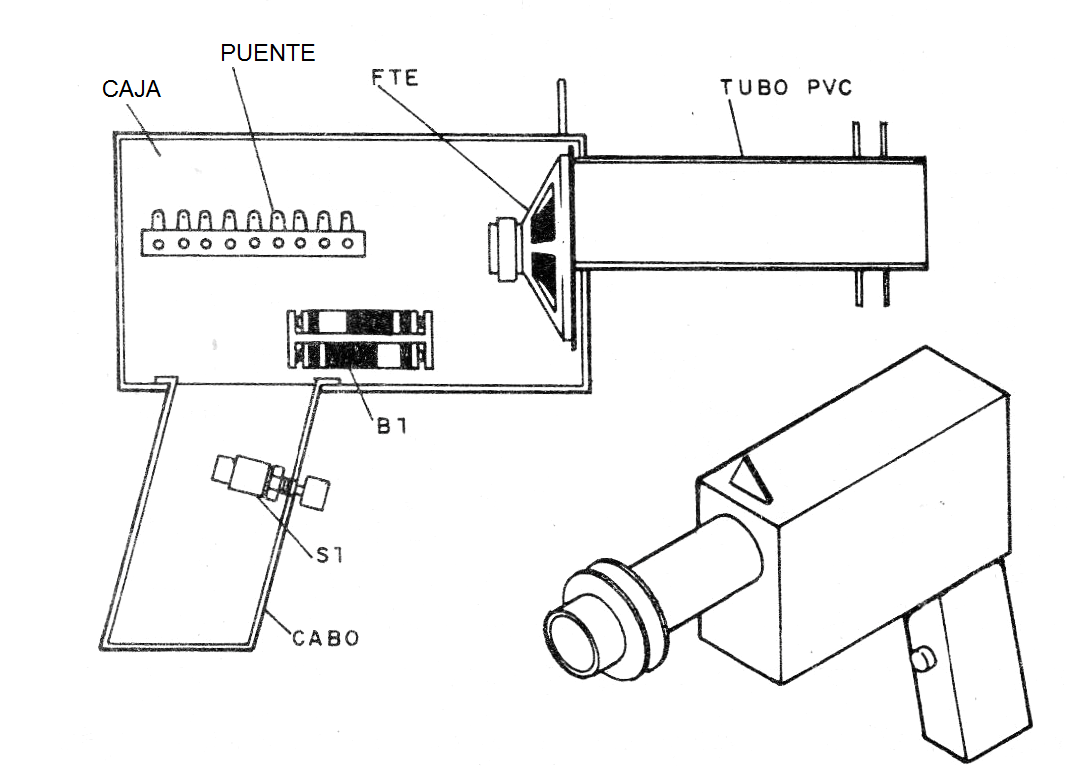 En la figura 3 damos una sugerencia de montaje en una cajita imitando un arma, donde el gatillo es un interruptor de presión.