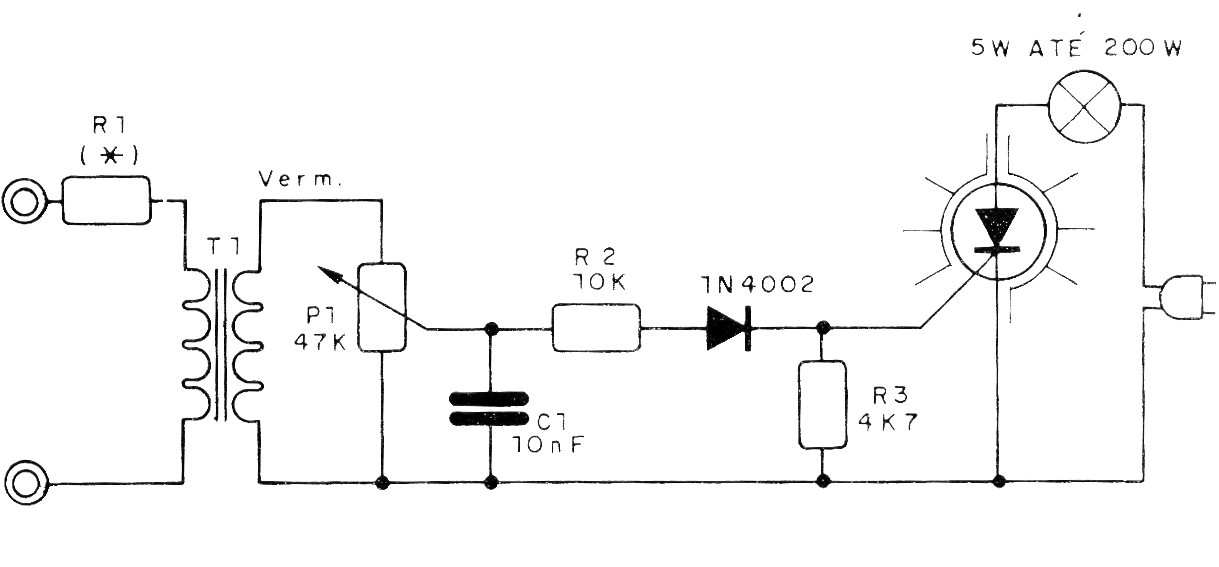 Observe que el SCR TIC106 debe estar dotado de un pequeño radiador de calor que consiste en una placa de metal doblada en U. El circuito puede controlar lámparas hasta 200 W sin problemas y el SCR debe ser el TIC106 B si la red es de 110 V y la red es de 110 V y TIC106D si la red es de 220 V.