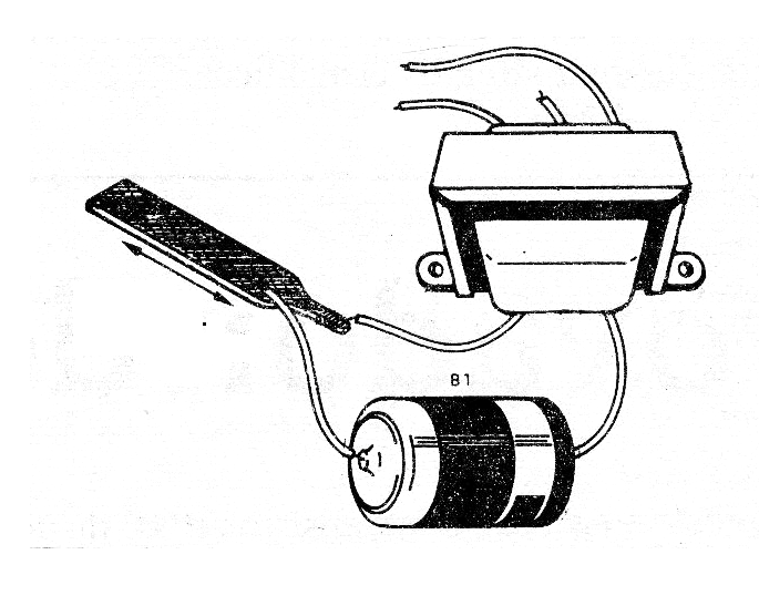 El transformador puede ser del tipo usado en viejas radios con válvulas o en pequeñas fuentes de alimentación con primario de 110 V o 220 V y secundario de 5 a 12 V con corriente de 250 a 300 mA. La bobina de baja tensión se conectará a la pila.