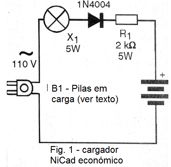 El circuito es de los más económicos por no utilizar transformador ya que la reducción de la tensión es hecha por una lámpara de 5 a 15 vatios para la red de 110 V, que también actúa como limitadora de corriente.