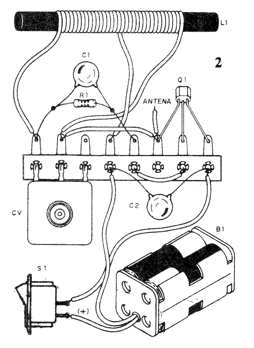 Lo que tenemos es básicamente un oscilador Hartley donde la frecuencia es determinada por L1 y CV. En el condensador CV hacemos el ajuste de la frecuencia. La banda dependerá de la bobina que puede tener de 20 +20 espiras de hilo 28 en un bastón de ferrita hasta 30 +30 espiras.