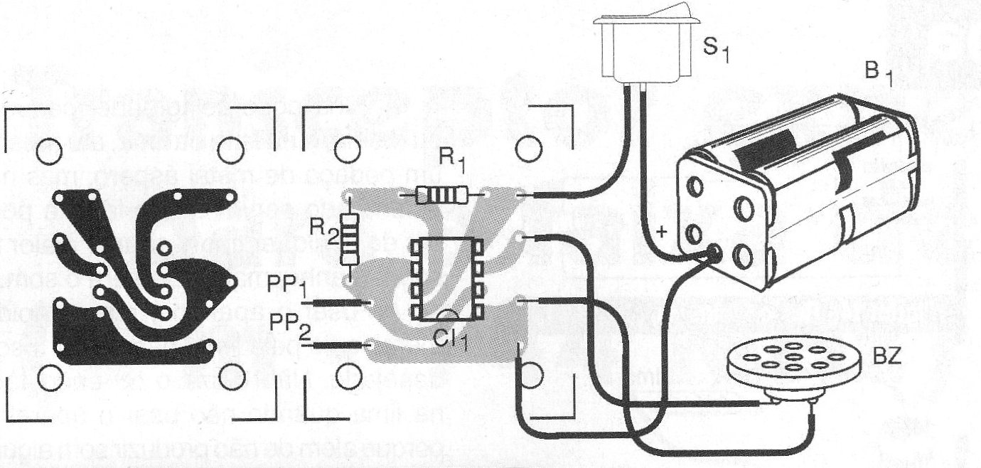 Para el circuito integrado, sugerimos el uso de un zócalo DIL de 8 pines. Los resistores son de 1/8 W y el transductor puede ser tanto del tipo piezoeléctrico como de cristal de alta impedancia.