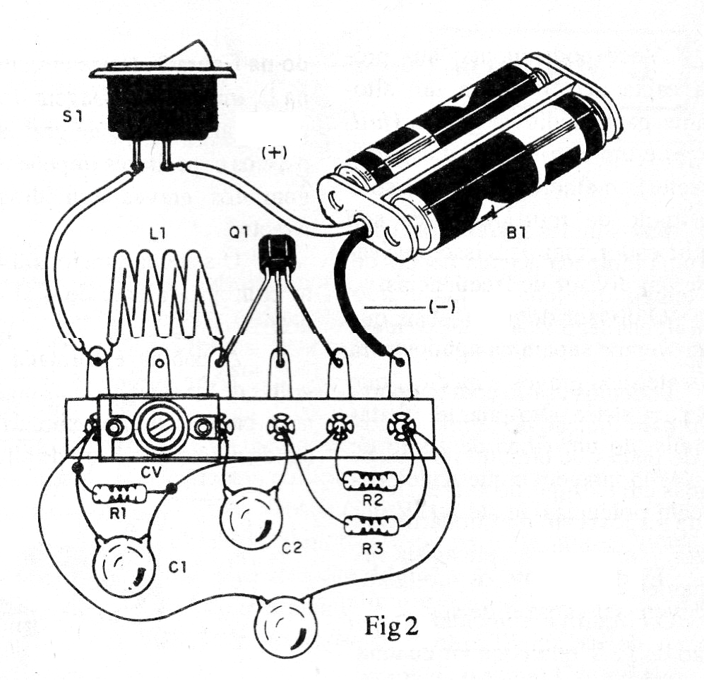 La bobina está formada por 3 o 4 espiras de hilo común con un diámetro de 1 cm sin núcleo. El trimmer antiguo de porcelana, mostrado en la figura 2, puede ser sustituido por un tipo moderno de plástico y su valor no es crítico, pudiendo quedar entre 15 y 40 pF de capacitancia máxima.