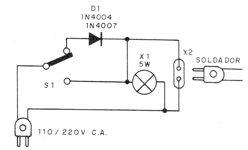 Con este circuito es posible trabajar con el soldador a una temperatura más baja, o aún mantenerlo caliente cuando en un estado de espera. Con la temperatura más baja podemos usarlo para pegar cajas de plástico, por ejemplo.