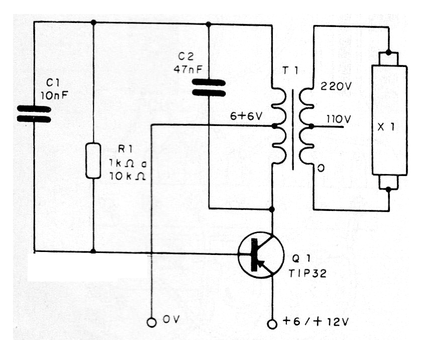 El capacitor C2 eventualmente debe cambiar para obtener el mejor rendimiento. En serie con R1 podemos conectar un potenciómetro de 10 k (usando R1 = 1k) y así ajustar el circuito pera el mejor rendimiento, conforme el transformador y la lámpara.