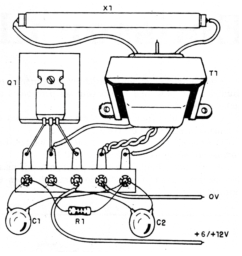 Con este circuito simple podemos encender lámparas fluorescentes de 4 a 20 W usando cuatro pilas grandes o una batería de 12 V. También podemos utilizar fuentes alternativas formadas por células solares, dinamos o de otras, siempre que suministran una corriente mínima de orden de 500 mA .