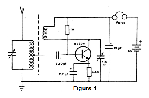 En la figura 1 encontramos el diagrama de un receptor regenerativo a transistores en el que parte de la señal extraída en la salida del transistor es llevada de vuelta a su entrada por medio de una bobina siendo entonces amplificado nuevamente.