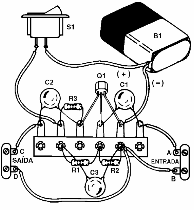El montaje no es crítico, pudiendo ser realizado en un pequeño puente de terminales conforme muestra la figura 2. Por supuesto, un montaje mejor sería la realizada en una placa de circuito impreso.