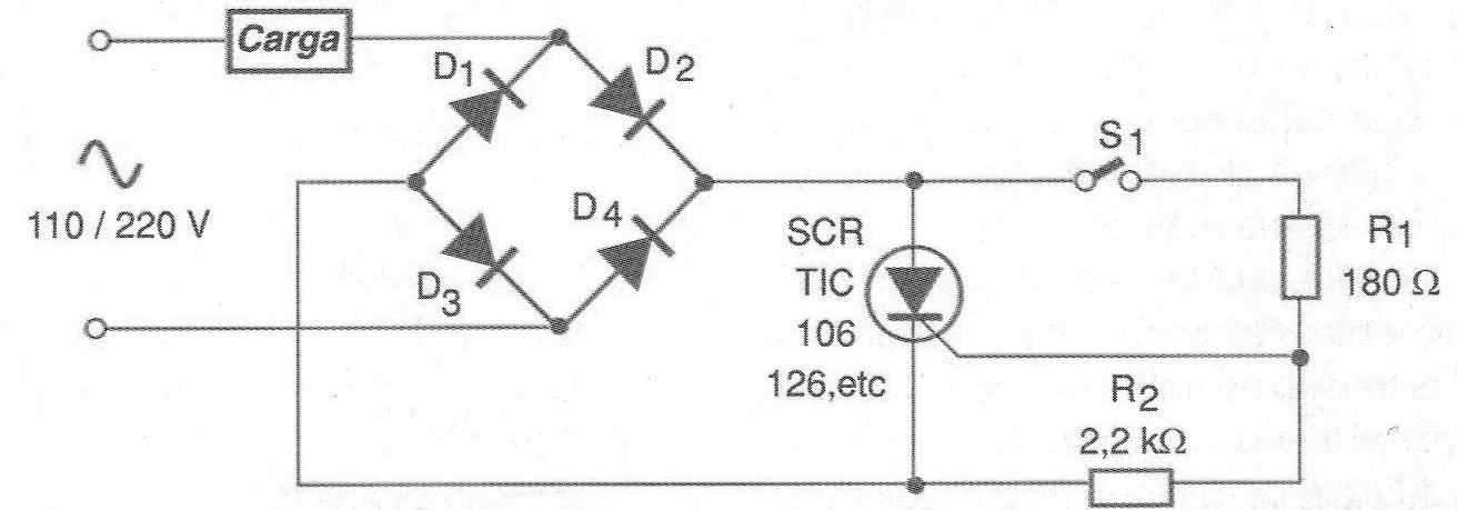 Este circuito puede controlar cargas de varios amperios (depende sólo del SCR usado) con una llave que no será recorrida por más de algunas decenas de miliamperios.