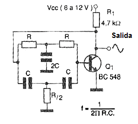 En la figura 1 tenemos entonces la configuración básica de un oscilador de doble-T.