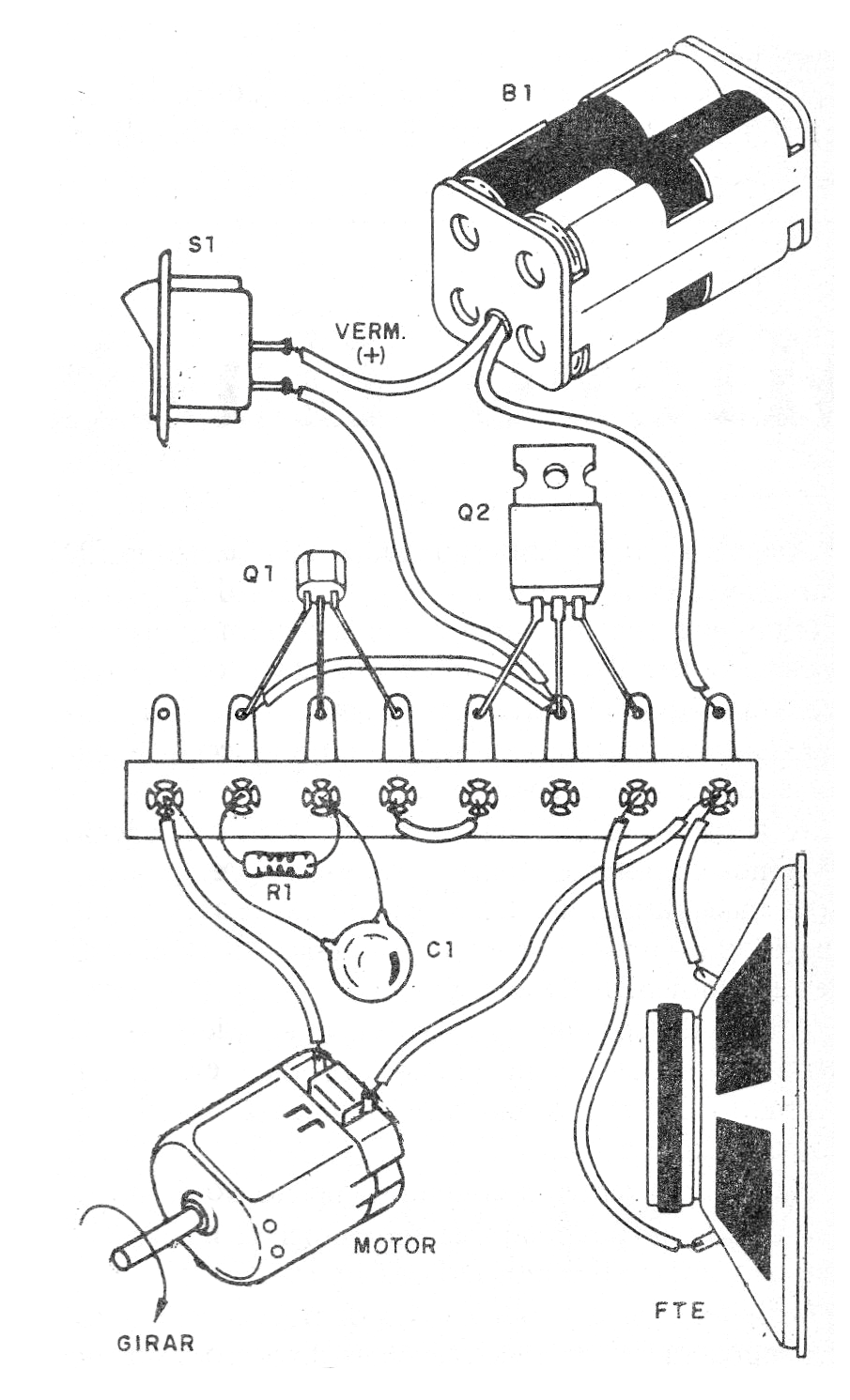 El circuito consta de un motor común de corriente continua que, al girarse, funciona como un pequeño dínamo produciendo una corriente cuya frecuencia depende de su velocidad. Esta corriente es amplificada por un circuito con dos transistores complementarios que excita directamente un pequeño altavoz.