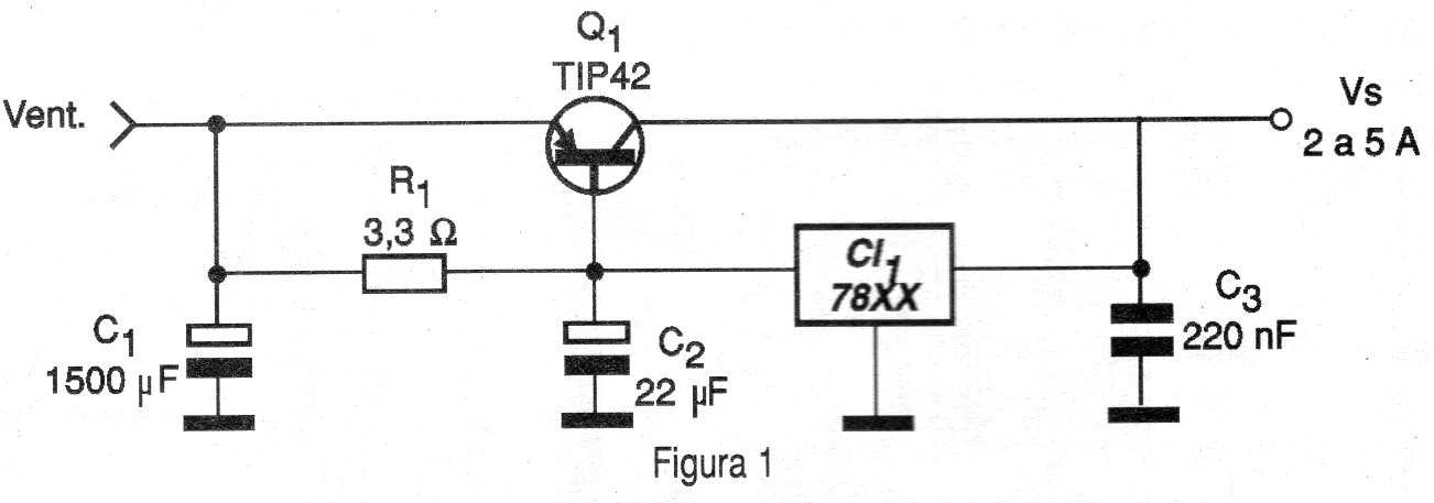 Con la configuración de la figura 1 es posible aumentar la corriente de salida de una fuente con regulador 78XX para corrientes en el rango de 2 a 5 amperios.