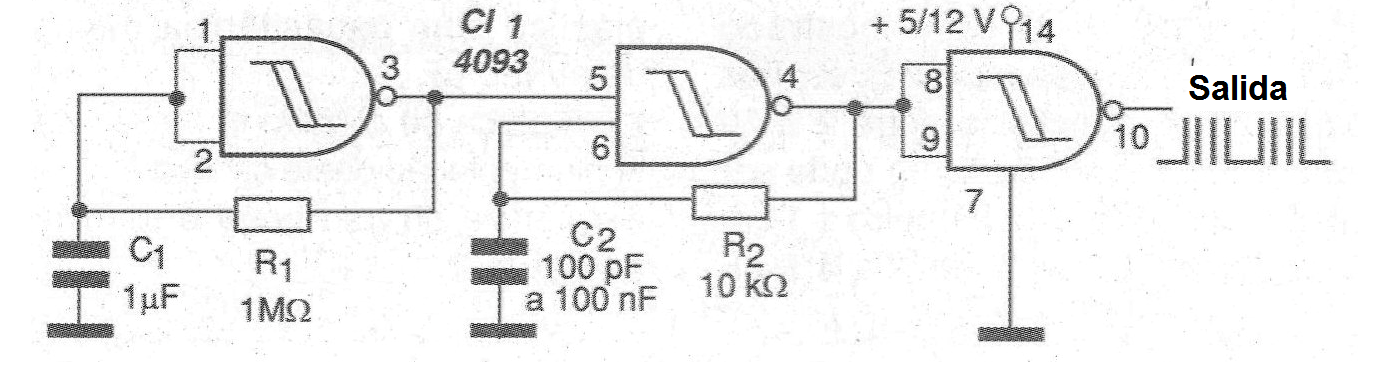 Otros intervalos pueden obtenerse con el cambio de estos componentes. La frecuencia de los pulsos es determinada por C2 y R2 que en el caso está alrededor de algunos quilohertz.