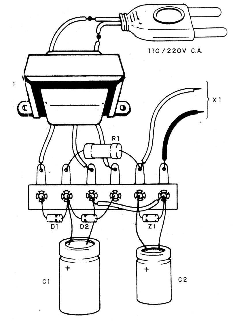 El resistor R1 eventualmente debe tener disipación de 1 W si el consumo del aparato alimentado es elevado y tiende a calentarse. Observe bien la polaridad del conector de salida. En la figura 2 tenemos el montaje utilizando un puente de terminales.
