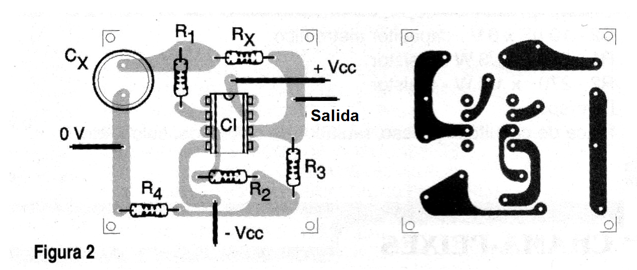 En la figura 2 tenemos una sugerencia de placa de circuito impreso para el montaje del oscilador.