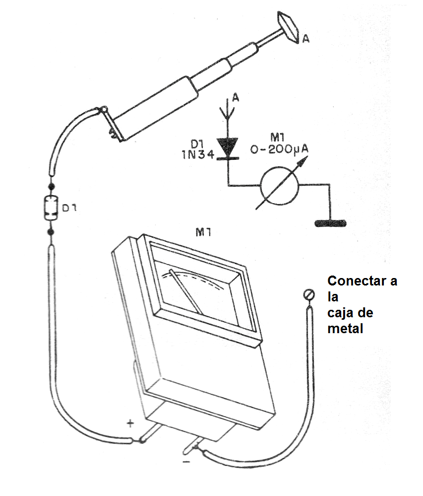 La antena puede ser un pedazo de hilo estirado o aún del tipo telescópico de 40 a 90 cm de longitud. El instrumento es un galvanómetro de 50 uA a 200 uA que puede obtenerse de aparatos de sonido antiguos. El diodo puede ser cualquiera de germanio como el 1N34, 1N60, etc.