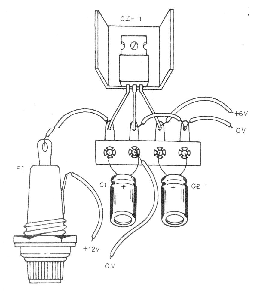 La base del circuito es un único circuito integrado regulador de tensión que proporcionará exactamente los 6 V que usted necesita aunque la entrada varía de 9 a 15 V. En la figura 1 tenemos el diagrama completo del convertidor.