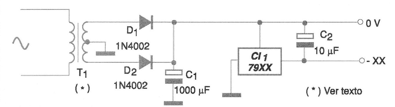 En la figura 1 tenemos el circuito completo de una fuente negativa de tensión, usando un CI de la serie 79xx.