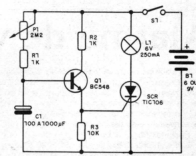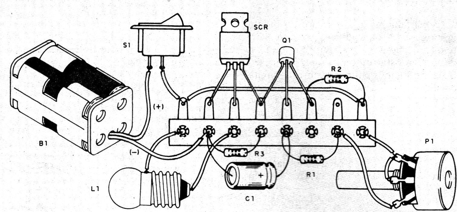 El SCR puede ser el TICIIO6 o equivalente a 30 V o más, y no necesita ser dotado de radiador de calor, a menos que la lámpara alimentada sea de más de 500 mA. En estas condiciones, debemos utilizar la batería en lugar de pilas, en la alimentación.