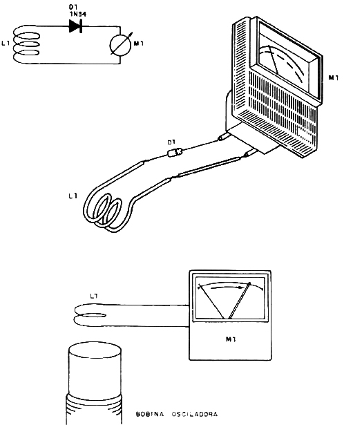 Aproximando esta bobina de cualquier circuito oscilante, de su bobina osciladora, si hay oscilación de alta frecuencia habrá la deflexión del puntero.