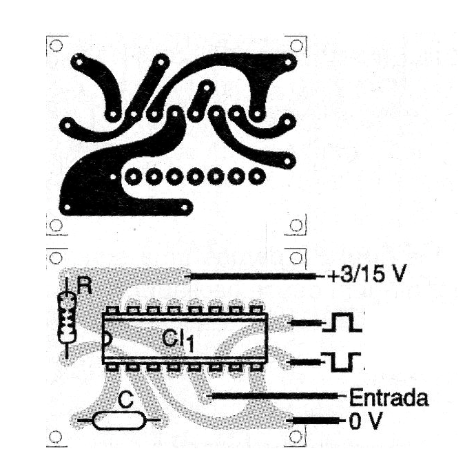 En la figura 2 tenemos una sugerencia de placa de circuito impreso que utiliza sólo uno de los monoestable disponibles en la configuración. La otra mitad del circuito integrado se puede utilizar en configuración equivalente.