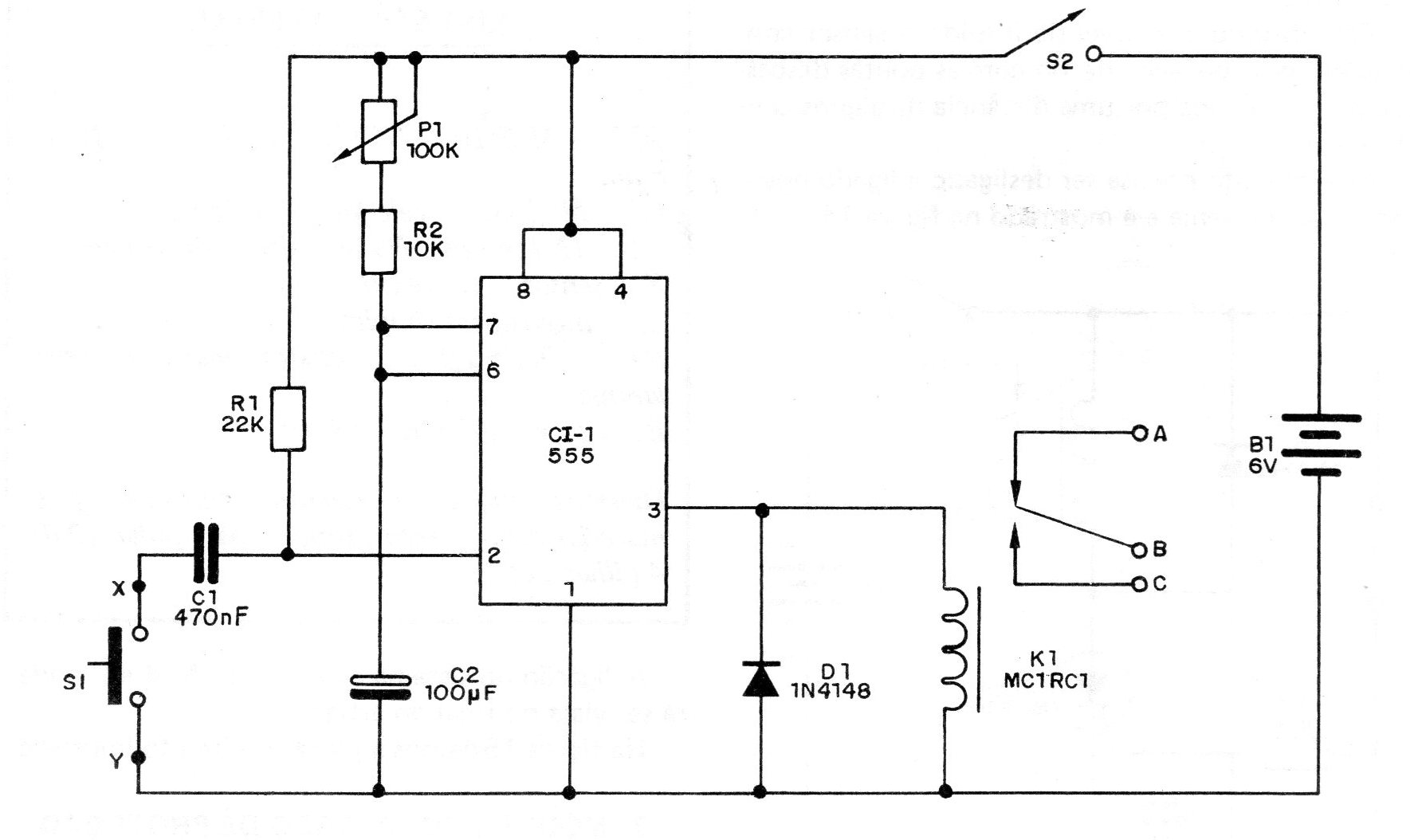 Tenemos aquí una interesante versión de alarma temporizada que puede utilizar los más diversos tipos de sensores. Una vez activado él mantiene disparado un circuito de alarma por un tiempo ajustado en P1. Este tiempo puede variar entre algunos segundos hasta cerca de 20 minutos dependiendo del valor de C2 que como máximo puede tener 470 uF y de P1 que como máximo puede tener 1 M.